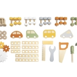 - Werkbank, gereedschap, schroeven en moeren, houten plaatjes, tandwielen, autootje, klok met wijzers