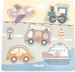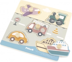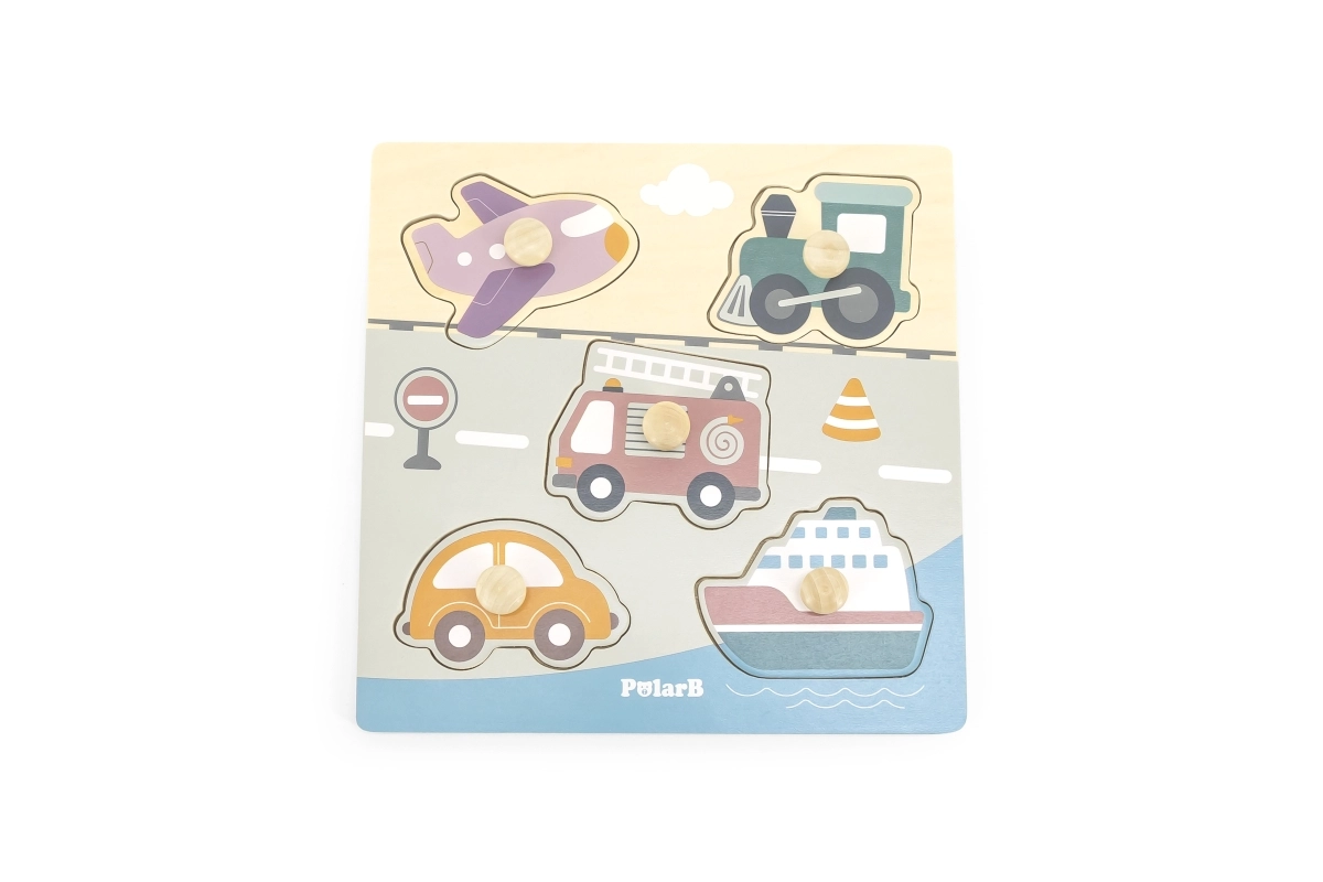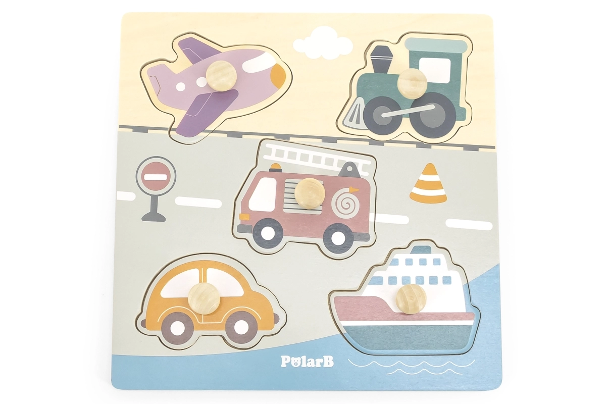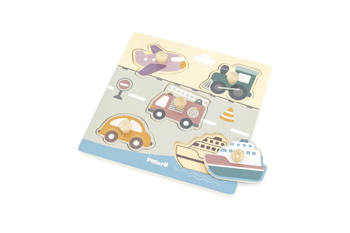Houten inlegpuzzel met het thema vervoersmiddelen. Afmeting van de houten plaat ca. 22 x 22 cm. Afmeting van de verpakking ca. 22 x 22 x 2,5 cm. Leeftijd 18m+