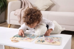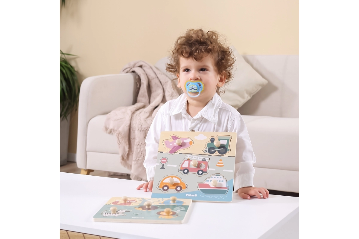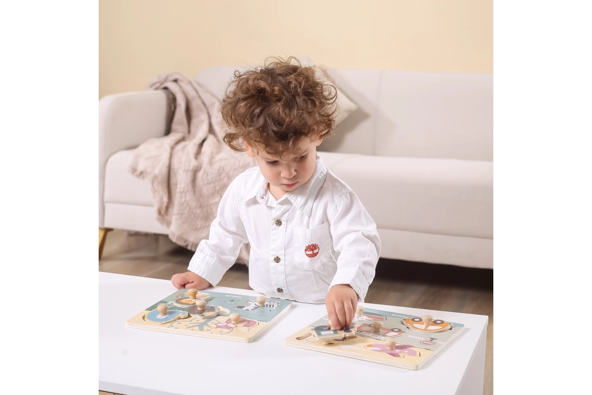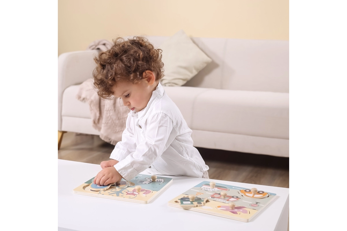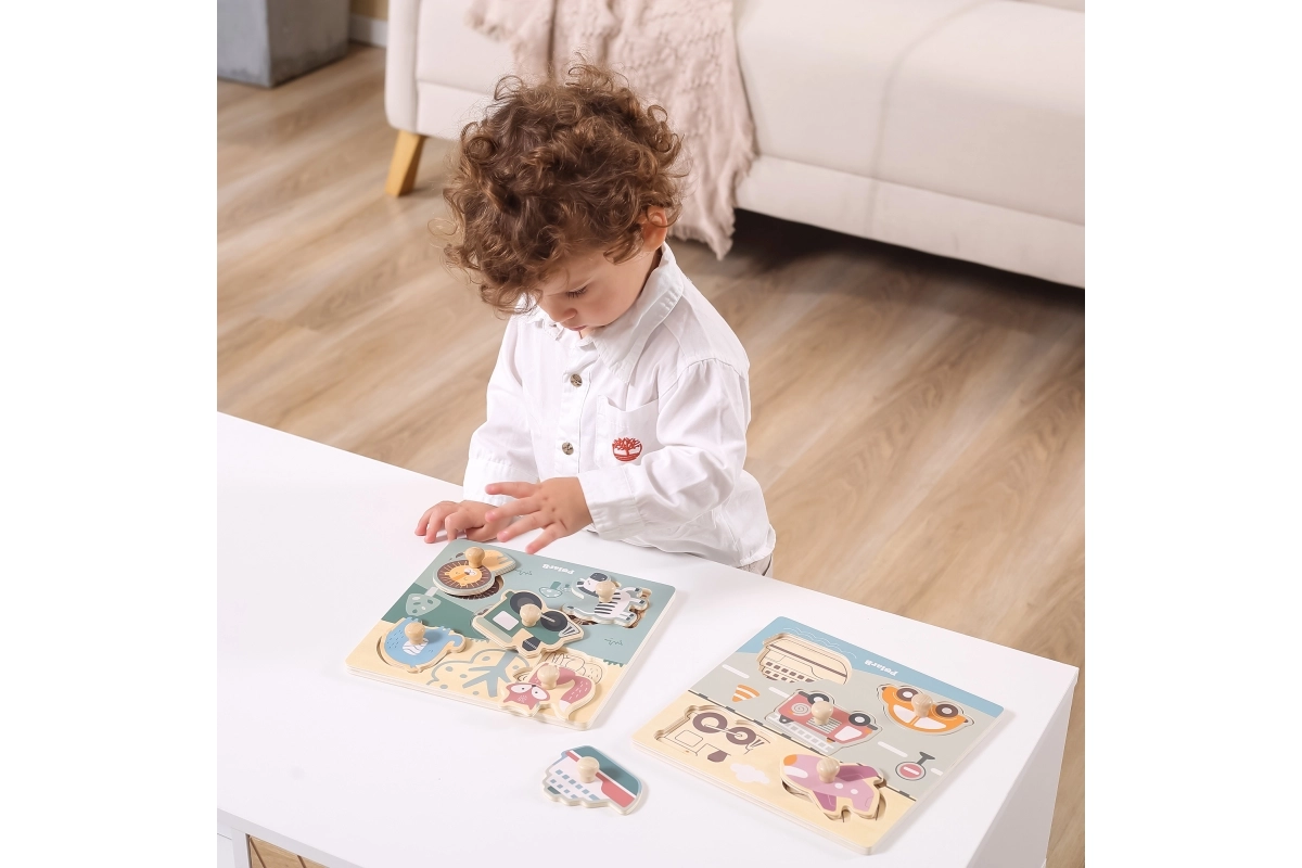 Houten inlegpuzzel met het thema vervoersmiddelen. Afmeting van de houten plaat ca. 22 x 22 cm. Afmeting van de verpakking ca. 22 x 22 x 2,5 cm. Leeftijd 18m+