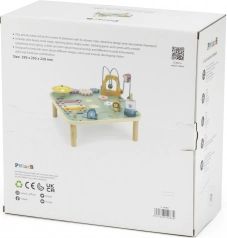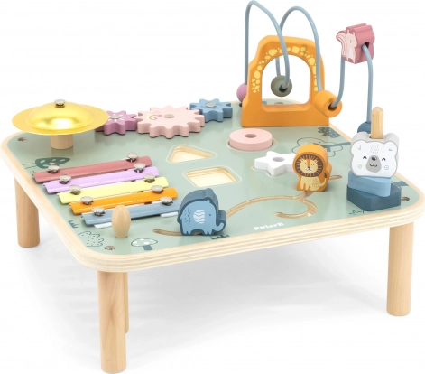 Houten activiteitentafel VIGA PolarB biedt kinderen vanaf 18 maanden uren ontdekken en creativiteit. Combineert een kralenlabyrint, xylofoon, gong, vormsorteren, schuifelementen en tandwielen. Het oppervlak is gelakt en gekleurd met niet-giftige verven in zachte pasteltinten die uitnodigen tot spel en de fijne motoriek, oog-handcoördinatie en herkenning van kleuren en vormen stimuleren.