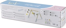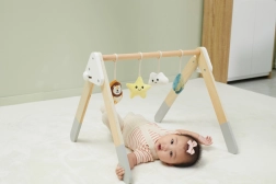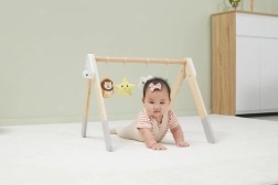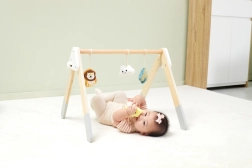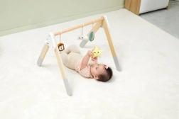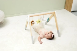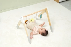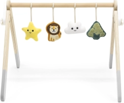 Deze hoogwaardige houten baby-gym is geschikt vanaf 1 maand. De natuurlijke uitstraling en zachte kleuren passen in ieder interieur. De hangspeeltjes trekken de aandacht met geluiden en verschillende texturen, die zicht, gehoor en tast stimuleren.