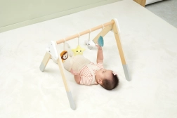 De gym kan gemakkelijk worden geplaatst op een kleed, speelmat, vloer of in het ledikant. De speeltjes rammelen, knisperen en piepen, waardoor hand-oogcoördinatie en natuurlijke nieuwsgierigheid zich ontwikkelen. De veilige afwerking is uitgevoerd met kindvriendelijke verven.