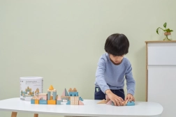 De gevarieerde vormen en afmetingen (ca. 2,5–9 cm) laten kinderen huizen, torens en een hele stad bouwen en oefenen het ruimtelijk inzicht.