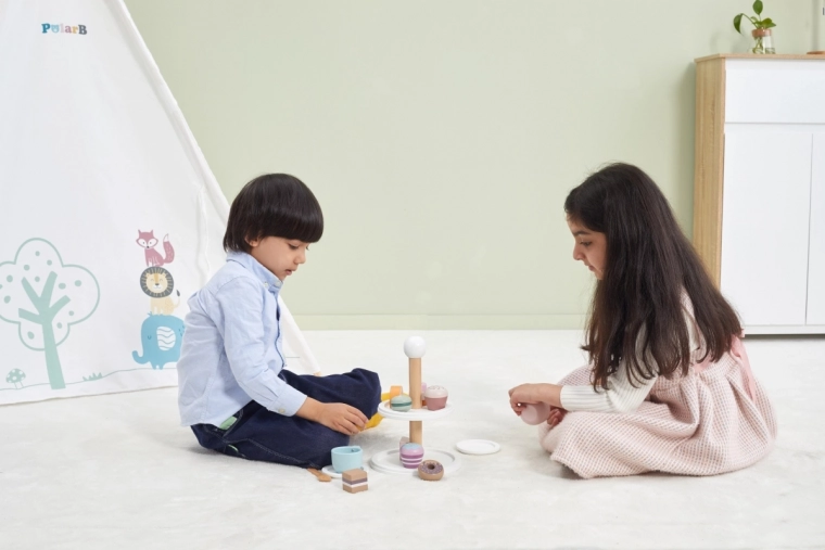 Rollenspel rond het theemoment bevordert communicatie, fantasie en samenwerking tussen kinderen. De kleurrijke gebakjes nodigen uit tot sorteren en tellen, terwijl kopjes en lepeltjes oog-handcoördinatie en fijne motoriek ondersteunen. Het elegante ontwerp in zachte kleuren past mooi in elke kinderkamer.