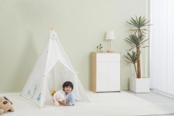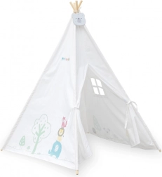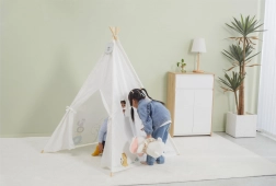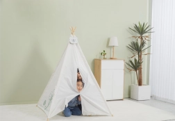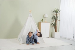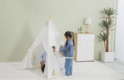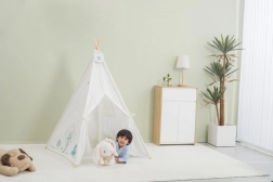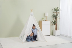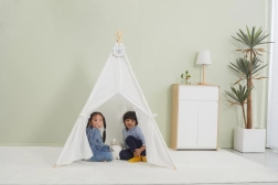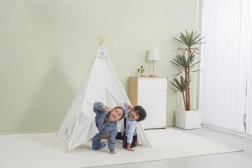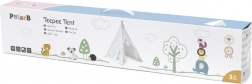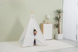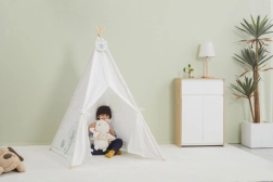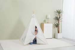 De POLARB tipi-tent verandert elke kamer in een magische plek vol fantasie. Het minimalistische design in wit met lieve diermotieven past in een modern interieur en creëert voor kinderen een rustige, inspirerende ruimte. De stevige constructie met houten stokken zorgt voor stabiliteit tijdens het spelen en je zet hem gemakkelijk op en weer neer.