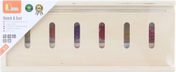 De houten sorter van VIGA is een doordachte educatieve montessori-hulp. Boven op de box plaats je een van de lange themaplanken en het kind stopt de houten stukjes in de juiste openingen volgens de afbeeldingen en categorieën. Het spel bevordert visuele waarneming, fijne motoriek en concentratie, en leert kinderen tegelijk fruit, groenten, dieren, vormen, verkeer en cijfers herkennen.