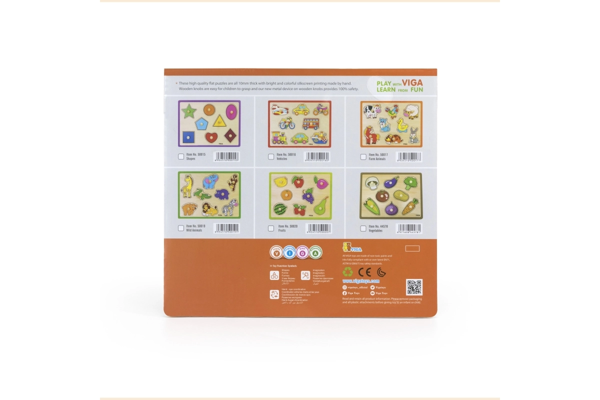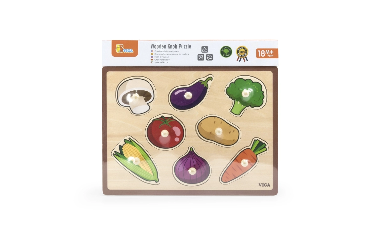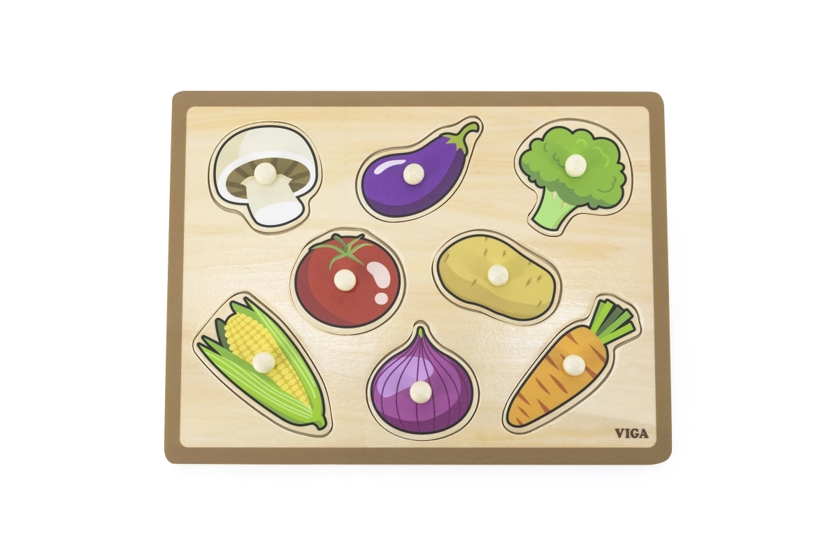 De houten groente-inlegpuzzel is een uitstekende keuze als eerste educatief speelgoed. Kinderen leren op een leuke manier vormen, kleuren en verschillende groentesoorten herkennen. De stevige houten plaat met uitsparingen en de glad afgewerkte stukjes zijn aangepast aan kleine kinderhanden.