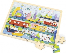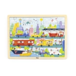 Deze kwaliteitsvolle houten puzzel met een kleurrijke stadsscène en vervoersmiddelen zal kleine ontdekkers enthousiasmeren. Dankzij de 48 stukjes en het stevige frame oefenen kinderen hun concentratie, oog-handcoördinatie en geduld. Heldere kleuren en duidelijke illustraties moedigen aan tot herhaald puzzelen.