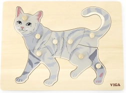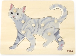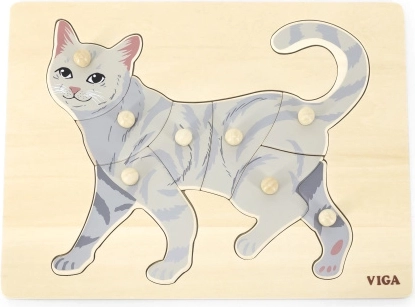 De taak van het kind is de afbeelding van de kat te leggen, niet alleen aan de hand van de illustratie, maar ook op basis van de vorm van de afzonderlijke stukjes. Knopjes maken het vastpakken met kleine vingertjes gemakkelijk en helpen de hand op de juiste manier te sturen. De stevige houten basis houdt de stukjes goed op hun plaats en is bestand tegen dagelijks gebruik.
