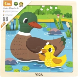 Deze houten kinderpuzzel met een motief van een eend en eendje zorgt voor leuk leren via spel. Negen stevige stukjes worden in een houten frame gelegd en vormen een vrolijke afbeelding van een vijvertje. Heldere kleuren, duurzaam materiaal en de doordachte vorm van de stukjes maken het hanteren makkelijk en zorgen voor de eerste successen bij het puzzelen.