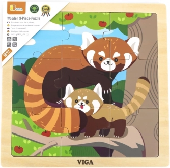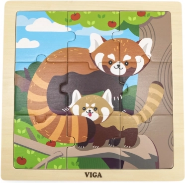 Houten puzzel met motief van een rode panda, ideaal voor de allereerste puzzelervaring. Bevat 9 stukjes die op een houten bord met lijst kunnen worden geplaatst, of de afbeelding kan ook zonder lijst los worden gelegd. De gelegde puzzel meet ca. 19,5 × 19,5 cm.