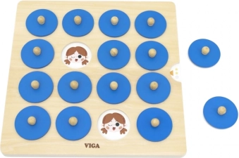 Dit kwalitatieve houten geheugenspel van VIGA is een geweldige manier om bij kinderen de cognitieve ontwikkeling en het visuele waarnemingsvermogen te stimuleren. Het kind tilt een blauw schijfje op aan het houten knopje, onthoudt de afbeelding en zoekt de tweede identieke – een eenvoudige mechaniek die zowel vermaakt als leert.