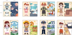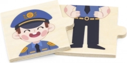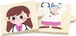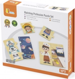 Het didactische houten spel van VIGA laat kinderen op een speelse manier kennismaken met verschillende beroepen – van arts en brandweerman tot kok of astronaut. Elk beroep bestaat uit drie delen: twee voor het personage en één groter voor de werkplek. Kinderen koppelen eerst het juiste duo en verbinden dit vervolgens met de omgeving.