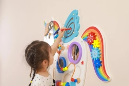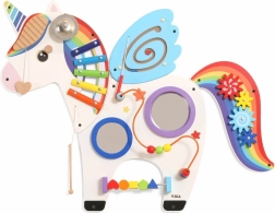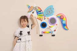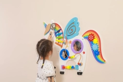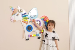 Deze multifunctionele wand-sensorische plaat in eenhoornvorm combineert muzikale, tactiele en logische elementen in één aantrekkelijk geheel. Kinderen spelen op de xylofoon, draaien aan de tandwielen, proberen de magnetische doolhof en spiegeltjes uit en oefenen kleuren, vormen en coördinatie.