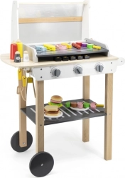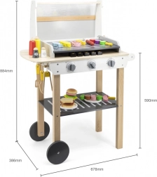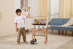 De uitgebreide set met 47 accessoires omvat groenten, vlees, borden, bestek, tang, kruiden, kooltjes en spiesstokjes – alles overzichtelijk op te bergen op de bovenste en onderste plank. Dankzij de wielen en het handvat kan de grill eenvoudig overal in huis of op het terras worden verplaatst. Hoogwaardige afwerking en doordachte details garanderen een lange levensduur en veilig spel.