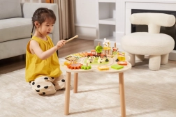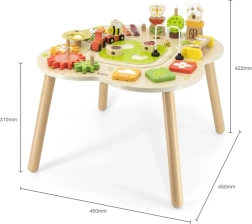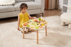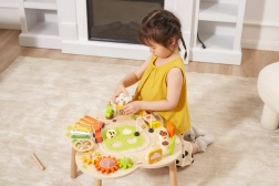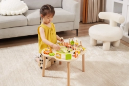 De tafel is afgewerkt met veilige, niet-giftige verven in levendige tinten die kinderen op natuurlijke wijze motiveren om te ontdekken. De rijke uitrusting – van tandwielen en xylofoon tot belletje, slimme puzzels en de treinbaan – garandeert urenlang zinvol plezier in de geest van Montessori.