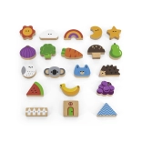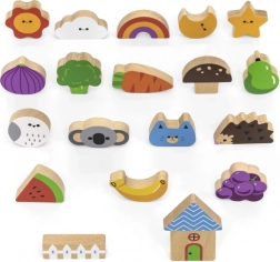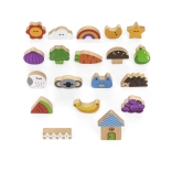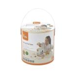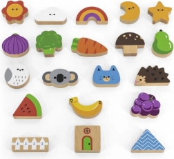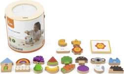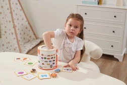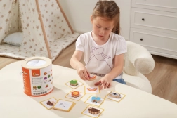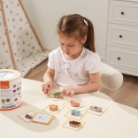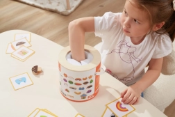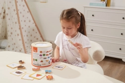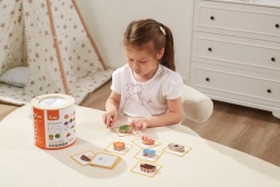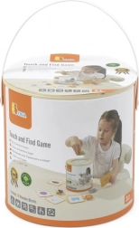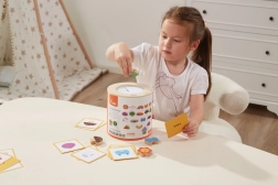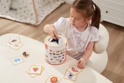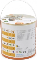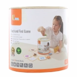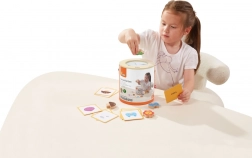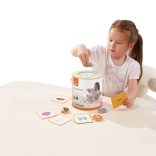 Spel Vang en vind. De set bevat 20 blokken, een papieren emmer, 20 speelkaarten en een deksel. Afmetingen van de verpakking ca. 16 x 15,5 cm. Leeftijd 3+