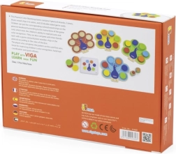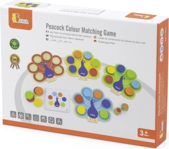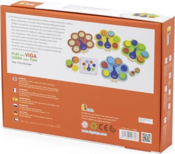 Het educatieve kinderspel VIGA Pauw leert kinderen op een speelse manier kleuren herkennen, en ontwikkelt fijne motoriek en oog-handcoördinatie. Gekleurde schijfjes worden in de staart van de pauw geplaatst volgens de kaarten of de worp met de kleuren dobbelsteen – ideaal voor Montessori leren, concentratie en samen spelen.