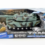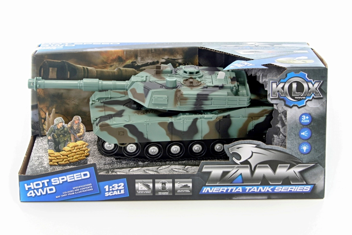 Leuke tank voor kinderen vanaf 3 jaar met donker camouflagemotief biedt schietgeluid, een oplichtend kanon en een draaibare loop in alle richtingen. De beweging wordt verzorgd door een vliegwiel, voeding 3× AG13 (batterijen zijn inbegrepen). Schaal 1:32, afmetingen ca. 22 × 8 cm.