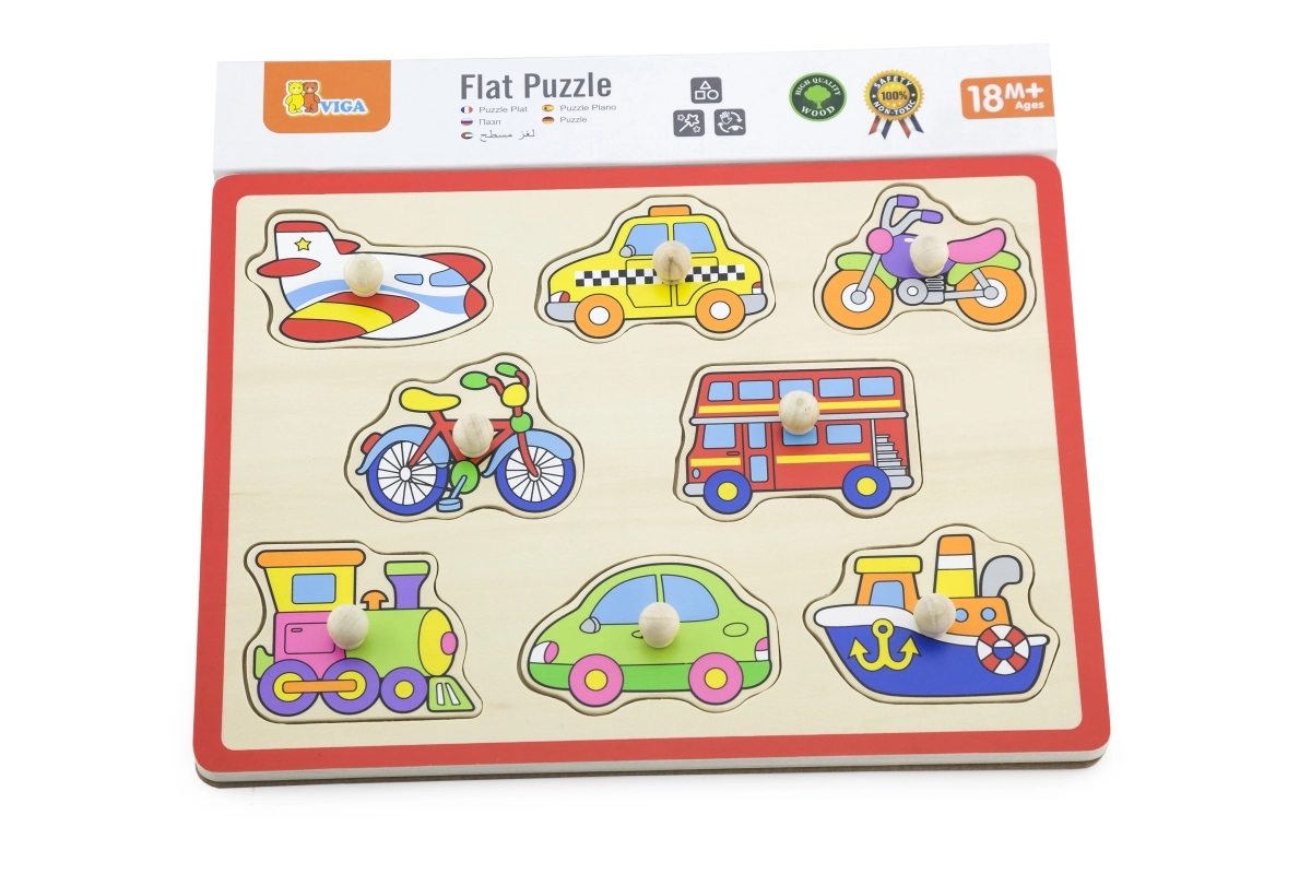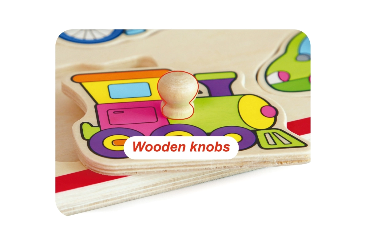 Deze hoogwaardige houten inlegpuzzel met voertuigen (vliegtuig, taxi, fiets, bus e.a.) biedt een speelse manier van leren. De stukjes met praktische knopjes passen in de voorgefreesde openingen, waardoor kinderen spelenderwijs hun vaardigheid en logisch denken trainen. De stevige houten plaat van ca. 30 × 22,5 cm is duurzaam en geschikt voor dagelijks gebruik.