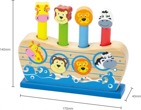 De stabiele houten basis in de vorm van een boot en vier houten stokjes met diertjes (giraffe, aapje, leeuw, zebra) creëren een veilige en duurzame speelomgeving. De fraaie verpakking maakt het een ideaal cadeau voor peuters en kleuters.