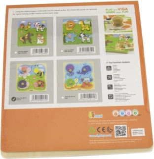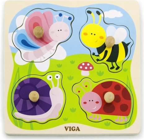 De VIGA houten inlegpuzzel met 4 grote stukjes en knopjes is de ideale eerste puzzel voor de allerkleinsten. De kleurrijke motieven van insecten en dieren uit de weide motiveren kinderen op natuurlijke wijze om te ontdekken en te leren. De gefreesde randen in de stevige houten basis helpen elk stukje betrouwbaar op zijn plek te blijven.