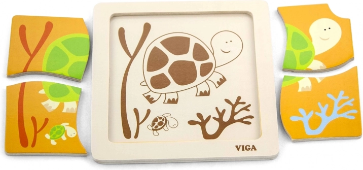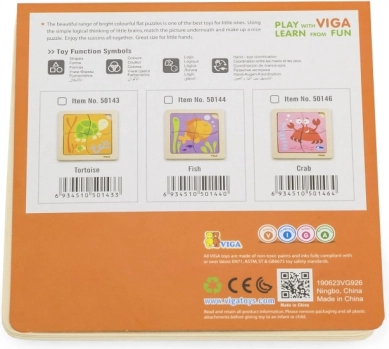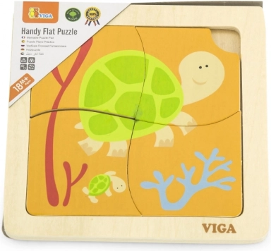 De houten puzzel met schildpadje is ontworpen voor kinderen vanaf 18 maanden. Hij bestaat uit vier grote stukjes die gemakkelijk in het houten frame passen of los kunnen worden gelegd. Elk stukje is kleurrijk en biedt een speelse manier om de ruimtelijke verbeelding en oog-handcoördinatie van kinderen te ontwikkelen.
