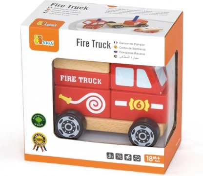 De houten bouwpuzzel brandweerauto van VIGA is het ideale speelgoed voor kleine hulpverleners. De gladde houten delen liggen prettig in de hand, zijn veilig te monteren en vormen na het in elkaar zetten een stevige auto die meteen “naar de brand” kan rijden.