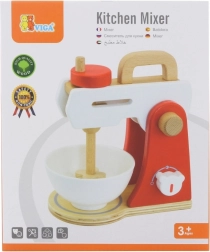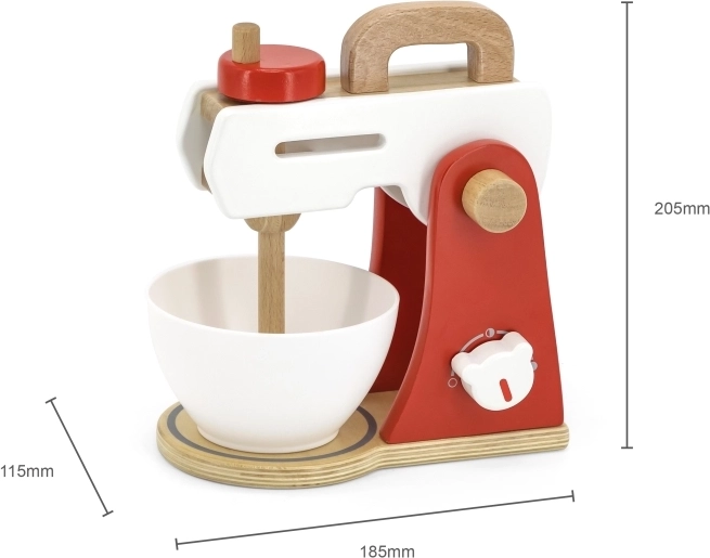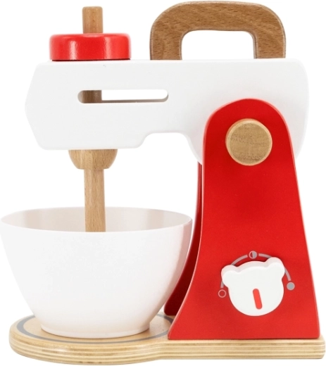 De mixer heeft een rood-wit ontwerp met houten elementen, waardoor het een realistische kopie van een echte keukenmachine is.