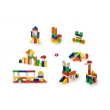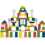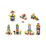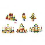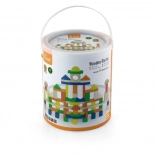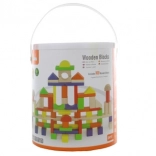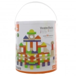 Houten bouwset in een emmer. Bevat 100 stukjes en een geïllustreerde brochure met bouwinstructies. Afmetingen van de verpakking ca. 18 x 21 cm. Formaat van de blokken 2,5 - 7,5 cm afhankelijk van het type. Leeftijd 2+