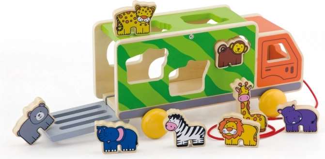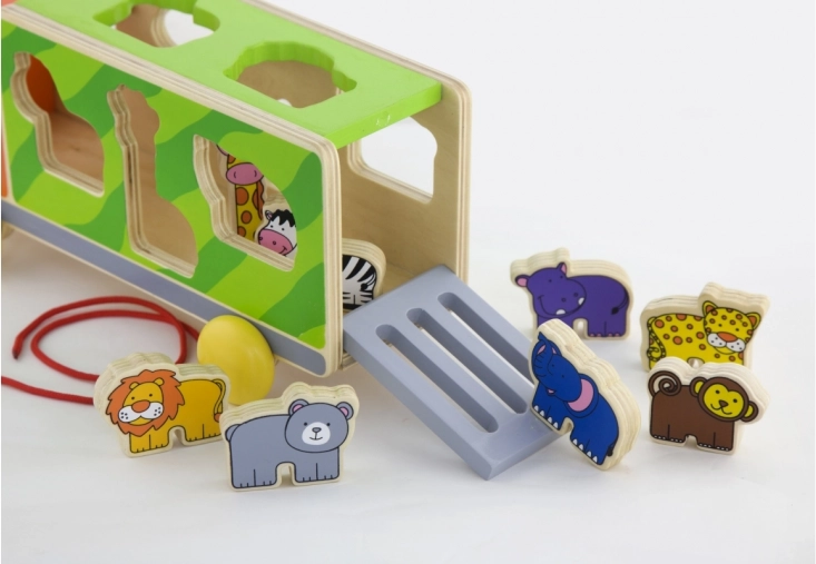 De vrachtwagen kan aan een touw worden voortgetrokken en dient tegelijk als slimme vormenstoof. Kinderen bewegen en gebruiken logisch denken bij het zoeken naar de juiste openingen voor de diertjes.