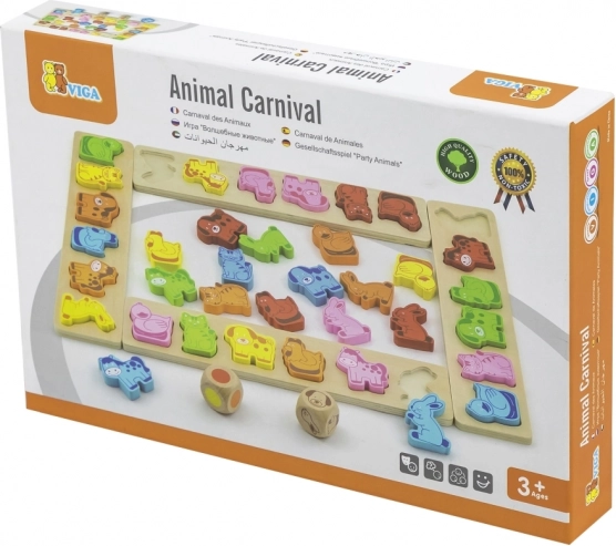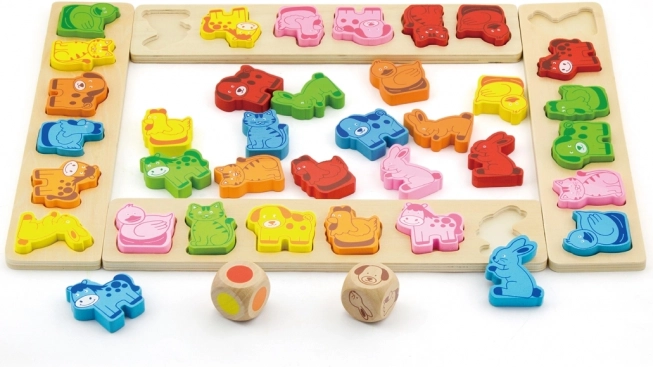 Een leuk houten spel voor kinderen vanaf 3 jaar dat het herkennen van kleuren en dieren ontwikkelt, snel denken en reageren traint en taal-, reken- en teamvaardigheden stimuleert. De set van hoogwaardige multiplex en beukenhout bevat 4 borden, 36 dierstukjes en twee dobbelstenen – een kleurdobbelsteen en een met dieren.
