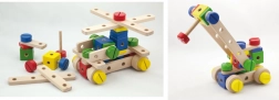 Gevarieerde blokken, verbindstukken, staafjes en schroefjes laten kinderen voertuigen, kranen en eigen originele constructies bouwen.