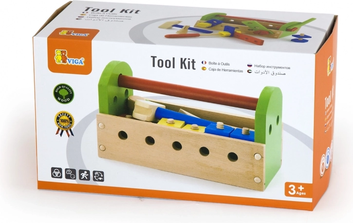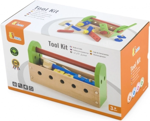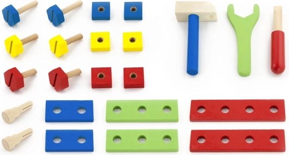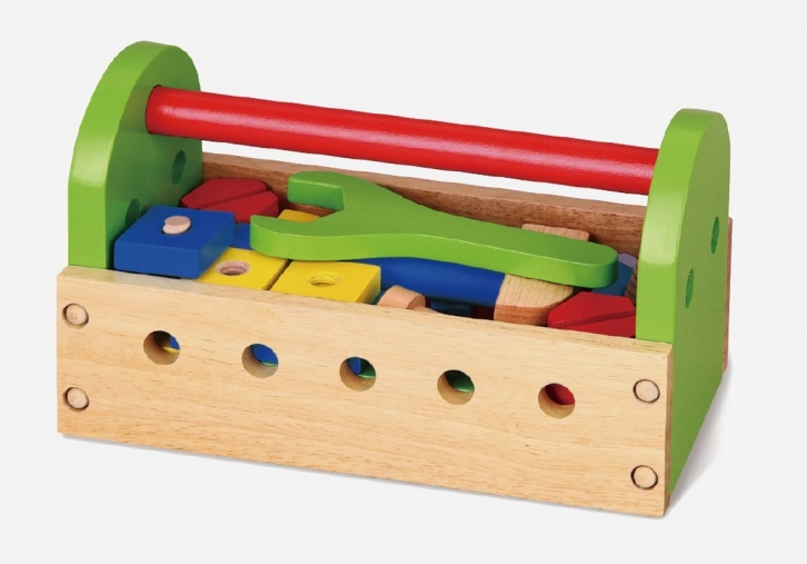 Leuke en veilige houten gereedschapsset voor kleine klusjesmannen vanaf 3 jaar in een praktische draagkist. Bevat een schroevendraaier, hamer, steeksleutel en kleurrijke schroeven, moeren en plankj... Meer tonen