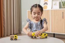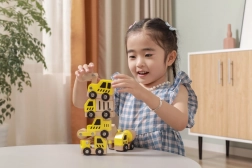 Elk voertuig heeft functionele wielen voor soepel rollen en sommige onderdelen suggereren beweegbare functies (bijv. bak, mixer of kraan), wat de natuurlijke nieuwsgierigheid en de ontwikkeling van de oog-handcoördinatie stimuleert.