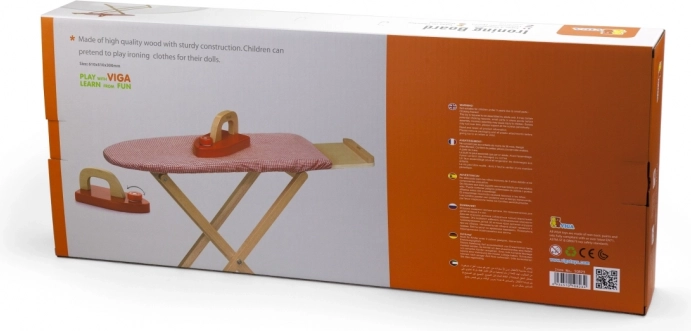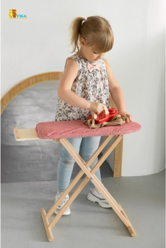 Stijlvolle en stevige houten strijkplank met strijkijzer van VIGA voor kinderen vanaf 3 jaar. Voorzien van een inklapbare constructie, een stevige stoffenhulp en een praktisch plankje voor accessoires. Perfect voor rollenspel en het ontwikkelen van de fijne motoriek. Afmetingen van de plank ca. 61 × 51 × 30 cm.