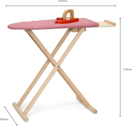 De set bevat een inklapbare plank met legplankje en een houten strijkijzer met draaiknop voor extra speelplezier. Dankzij de compacte afmetingen is alles eenvoudig op te ruimen en past het in elke kinderkamer.