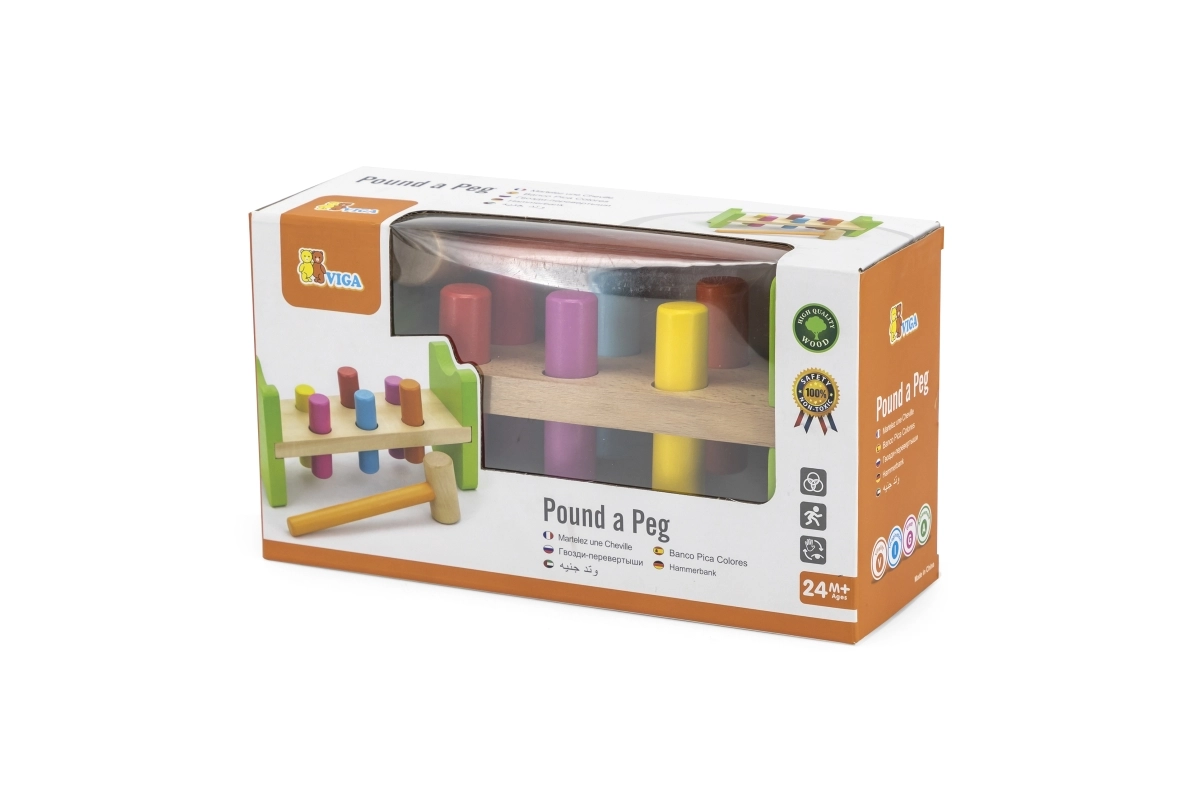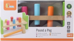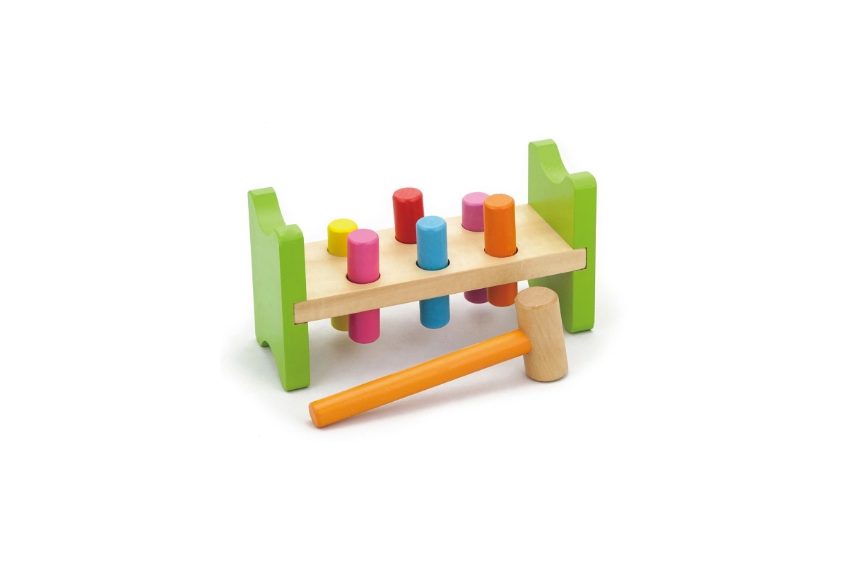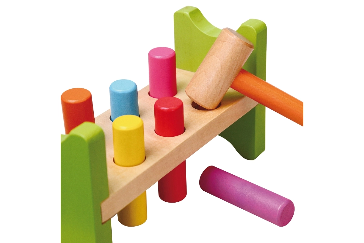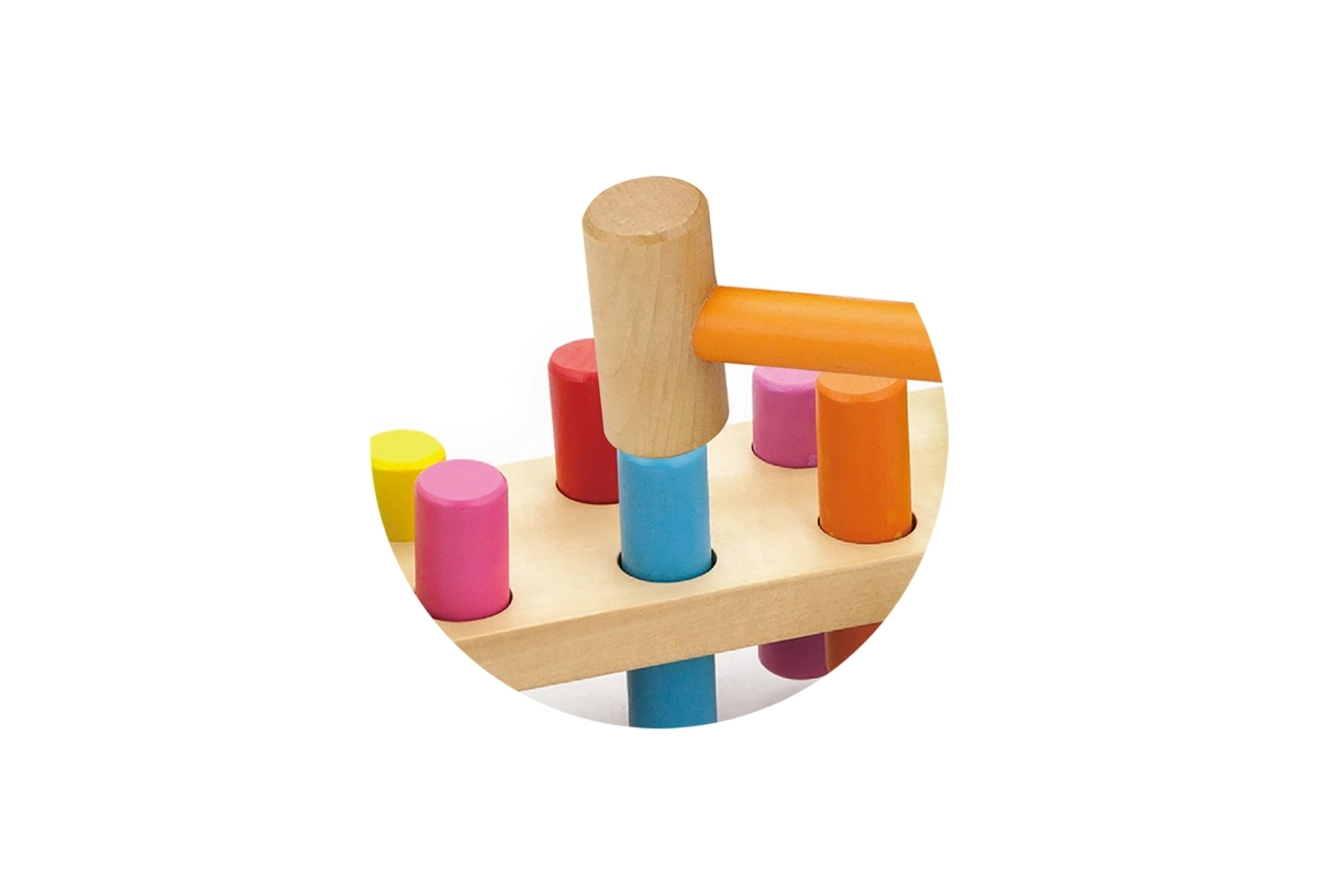 Inclusief houten hamertje en meerkleurige pinnetjes voor langdurig speelplezier.