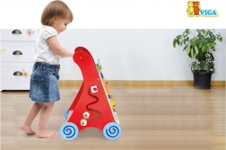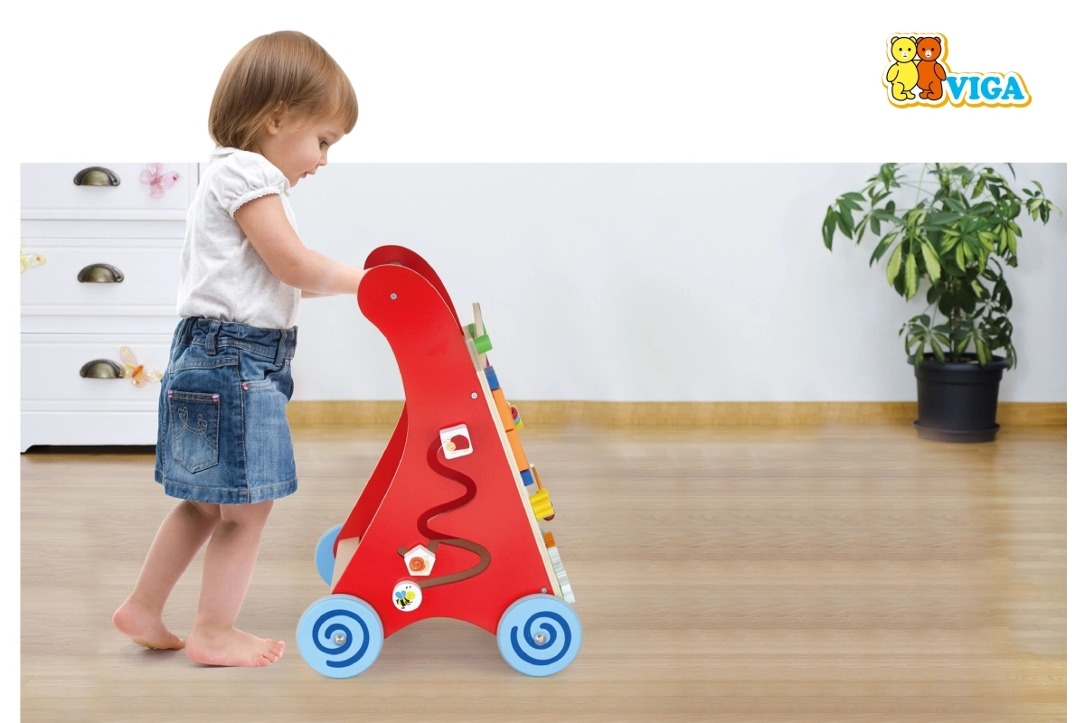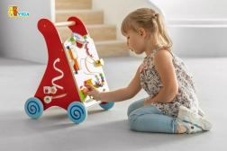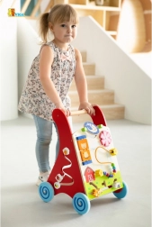 Breed uitstaande wielen met rubberen loopvlakken beschermen de vloer en verhogen de stabiliteit, het houten handvat ligt goed in kleine kinderhanden. Het product is gemaakt van gelakt hout; lakken en verven voldoen aan de normen EN71 en ASTM. Ideale hulp voor thuis om motoriek, geduld en fantasie te ontwikkelen.