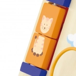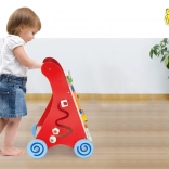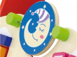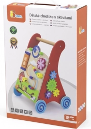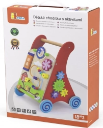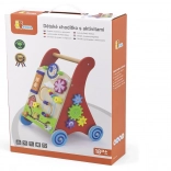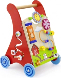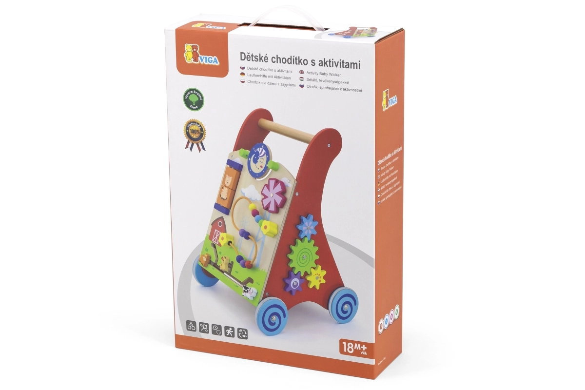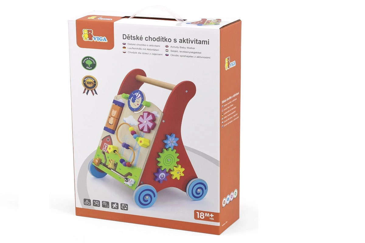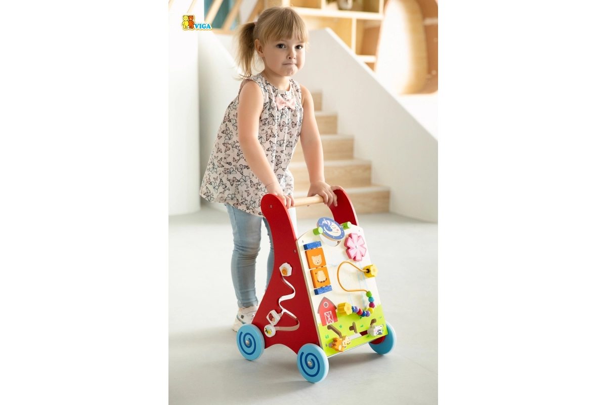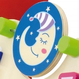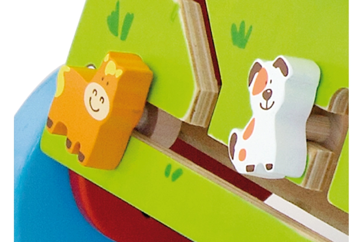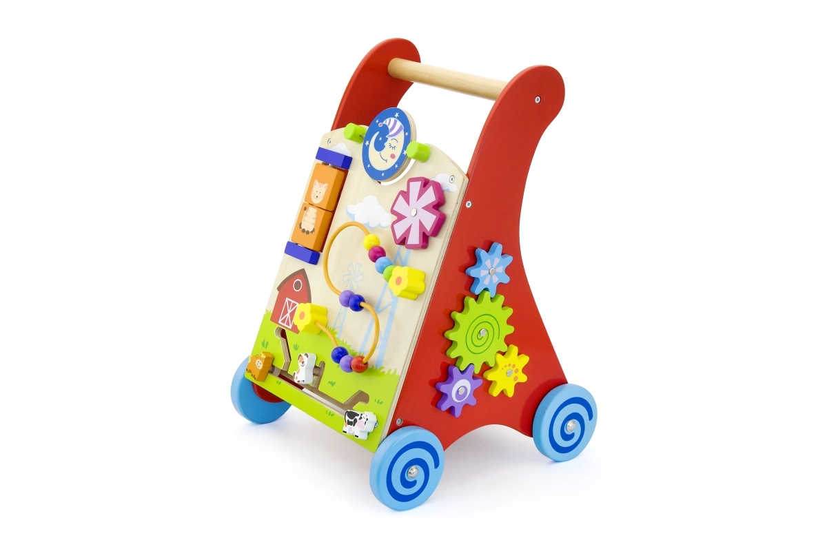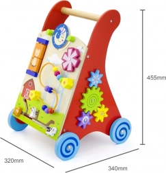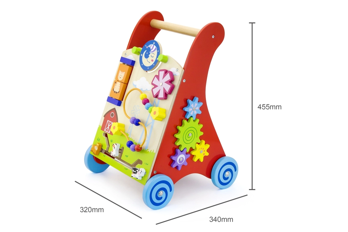 Deze kwalitatieve houten loopwagen met activiteitencentrum combineert steun bij het lopen met rijke sensorische prikkels. Het voorpaneel biedt draaielementen met zon en maan, een draaiend molentje, een kralenbaan met vijf kralen, een draaibare schijf met een kat en schuivende diertjes (koe, hond, paard) over een spoor naar de schuur. De zijkanten worden aangevuld met tandwielen en een baan met een bij, een lieveheersbeestje en een slak.