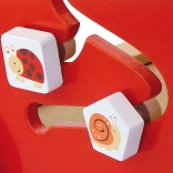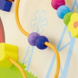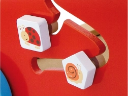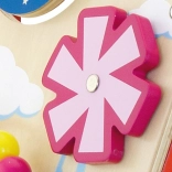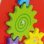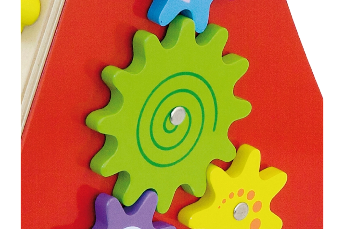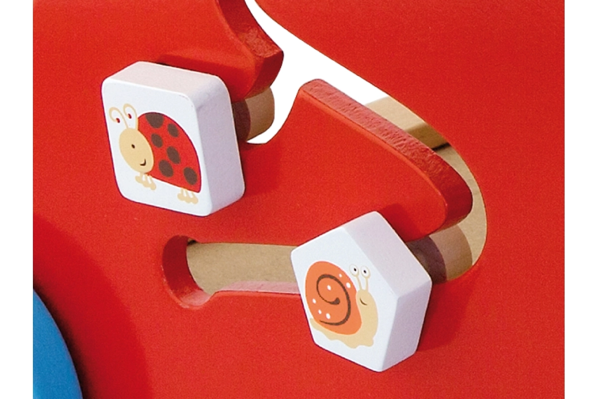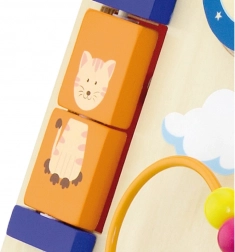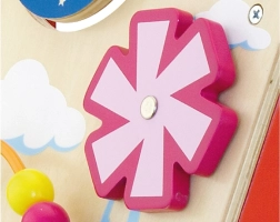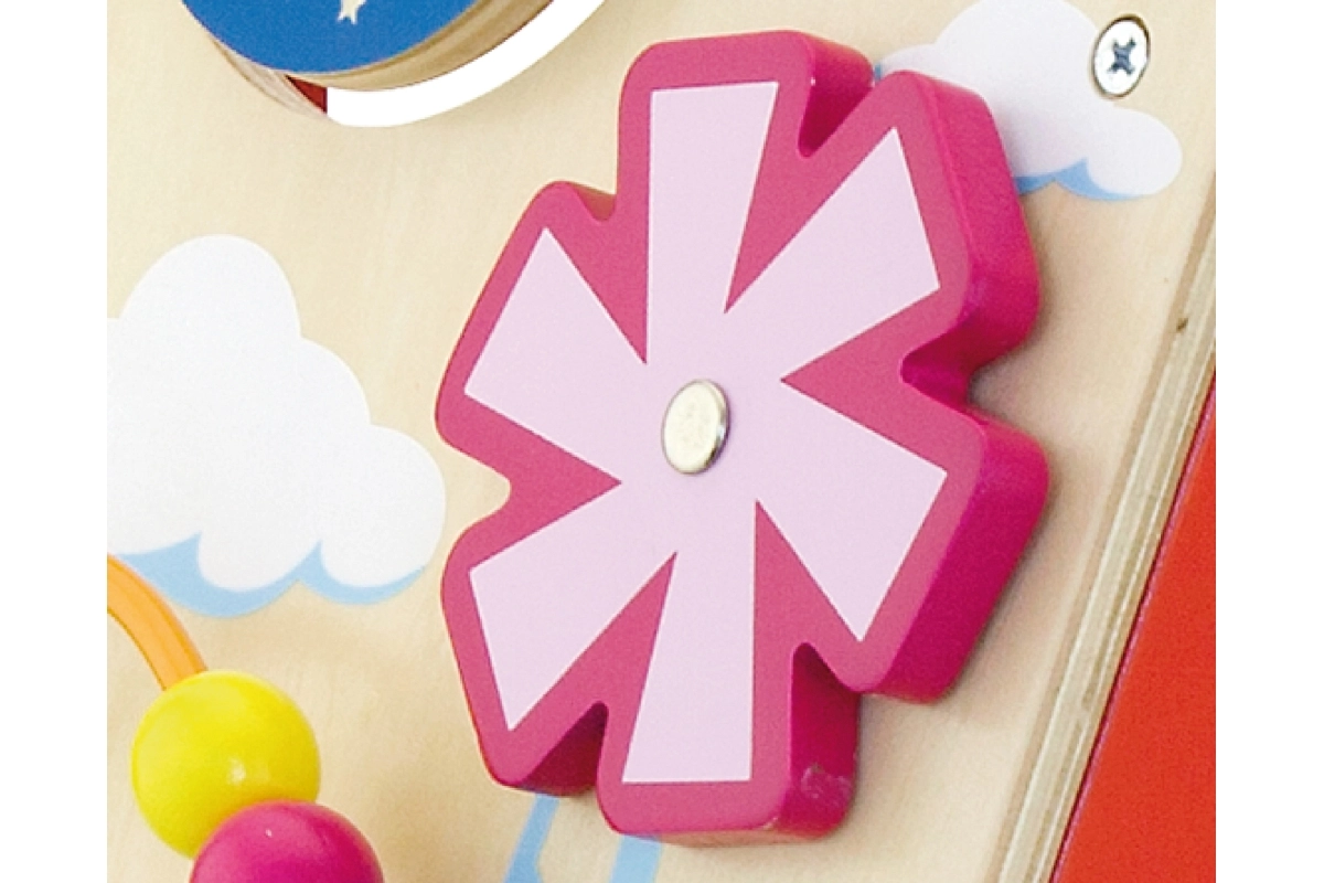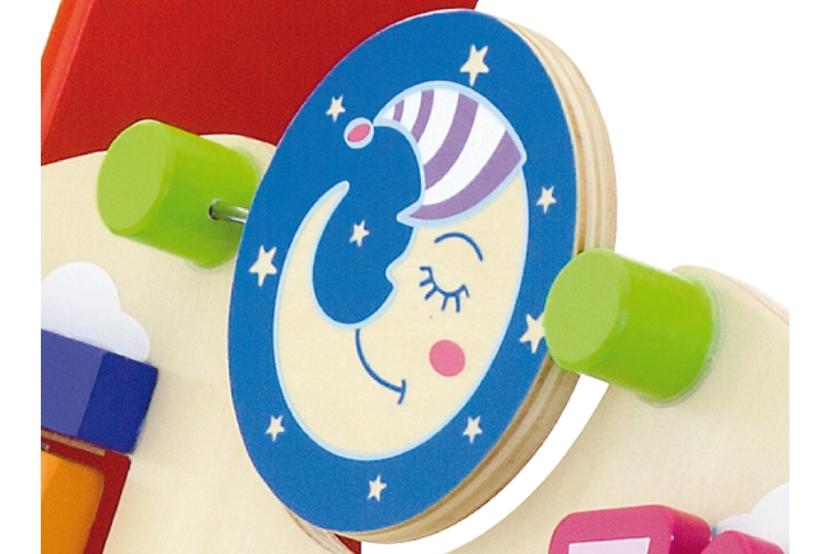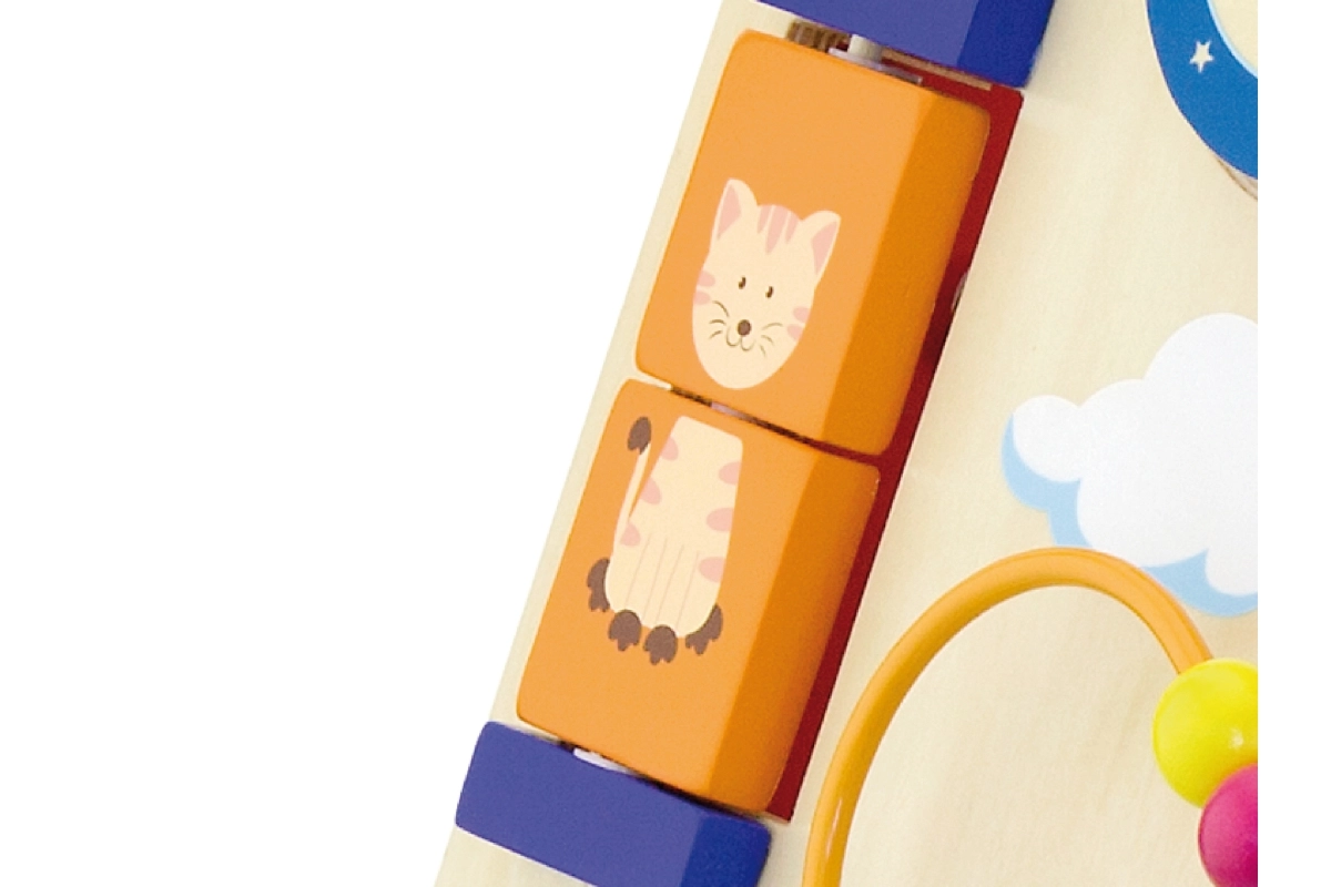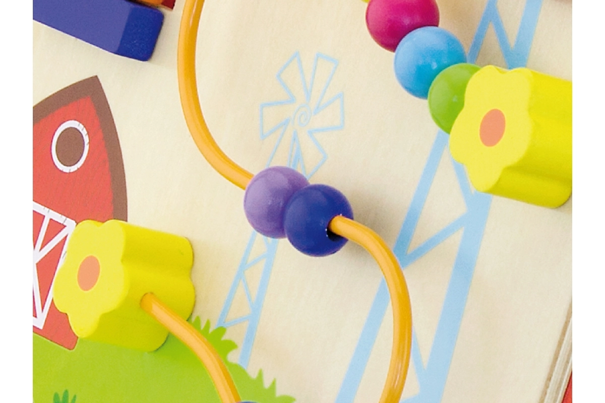 Draai-elementen, schuivende diertjes, een kralenlus en een molentje ondersteunen de fijne motoriek, het geduld en het inzicht in oorzaak en gevolg.