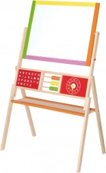 Dit veelzijdige houten bord is ideaal voor kinderen vanaf drie jaar dankzij zijn vele functionaliteiten. Het biedt een magnetisch oppervlak geschikt voor stiften zonder drukpunt en een krijtbord voor traditioneel schrijven en tekenen. Het bord omvat ook leuke en educatieve elementen: