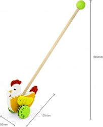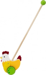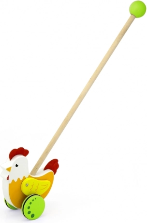 Deze duwer met kip ondersteunt kinderen bij de ontwikkeling van hun loopbeweging en coördinatie.