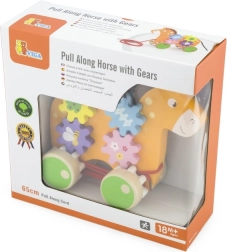 Het paardje heeft kleurrijke tandwielen die draaien wanneer het speelgoed beweegt, wat jonge kinderen helpt hun motorische vaardigheden te ontwikkelen.