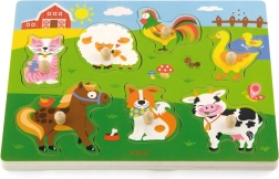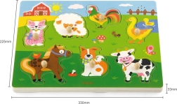 Houten dieren-inlegpuzzel met geluid. Wanneer het juiste dier wordt geplaatst, klinkt het geluid dat het dier maakt. Afmetingen bord ca. 30 x 22,5 x 2 cm. Voeding: 2 x AAA-batterijen (niet inbegrepen). Afmetingen verpakking ca. 30 x 27 x 2 cm. Leeftijd 18 mnd+