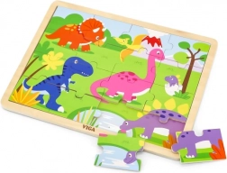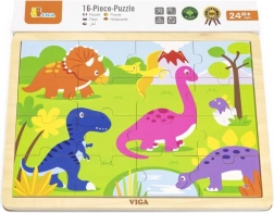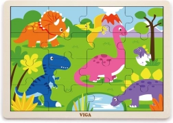 Ontdek de kwalitatieve VIGA houten dinosauruspuzzel die kinderen hun eerste plezier in puzzelen biedt. 16 stukjes trainen de fijne motoriek, oog-handcoördinatie en logisch denken. Je kunt de stukjes leggen op de houten plaat met kader of de afbeelding maken zonder kader. Het formaat van de gelegde puzzel is ca. 27,5 × 20 cm, geschikt vanaf 24 maanden.