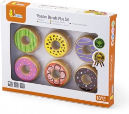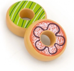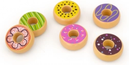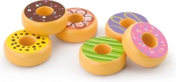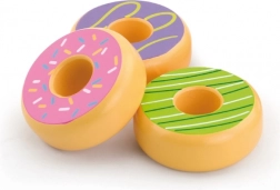 Speelse set van zes houten donuts voor kinderen vanaf 18 maanden, stimuleert fijne motoriek, fantasie en rollenspellen zoals winkel of café. Elke donut heeft een andere kleurrijke decoratie en een aangenaam glad oppervlak voor veilig hanteren.