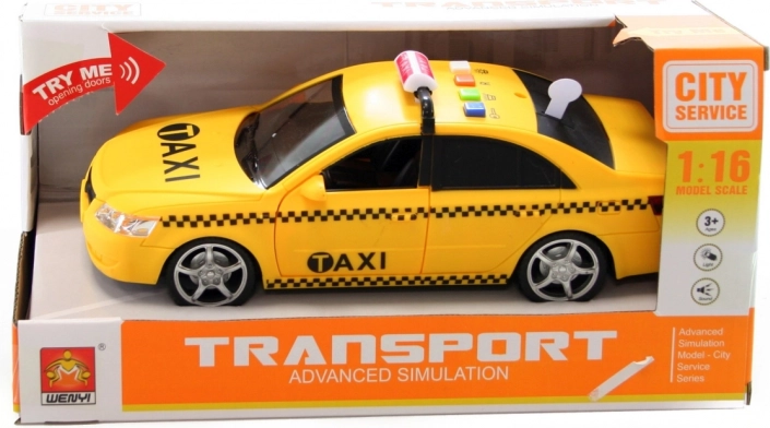 Plastic taxi op batterijen met licht, geluid en openende deuren. Batterijen 3× AG13 inbegrepen. Afmeting auto ca. 23 × 7 cm. Geschikt voor kinderen vanaf 3 jaar.