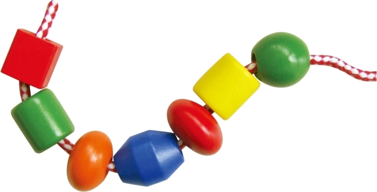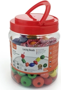 De plastic doos bevat grote houten kralen en gekleurde veters waarop de kralen geregen kunnen worden. Afmeting van de kraal ca. 2 x 2 cm, afhankelijk van het type. Afmetingen van de verpakking ca. 16 x 12 cm. Bevat 90 kralen en 5 koorden. Leeftijd 3+.