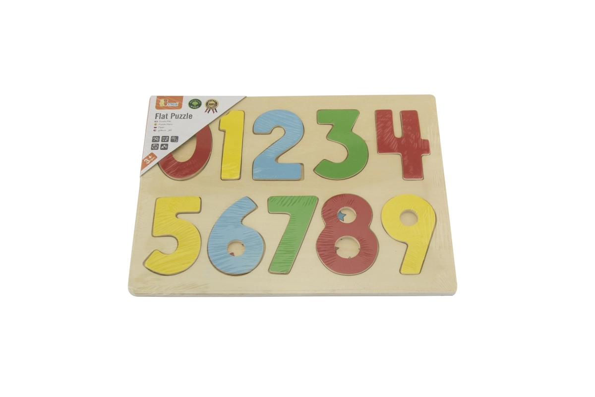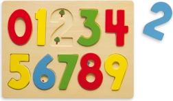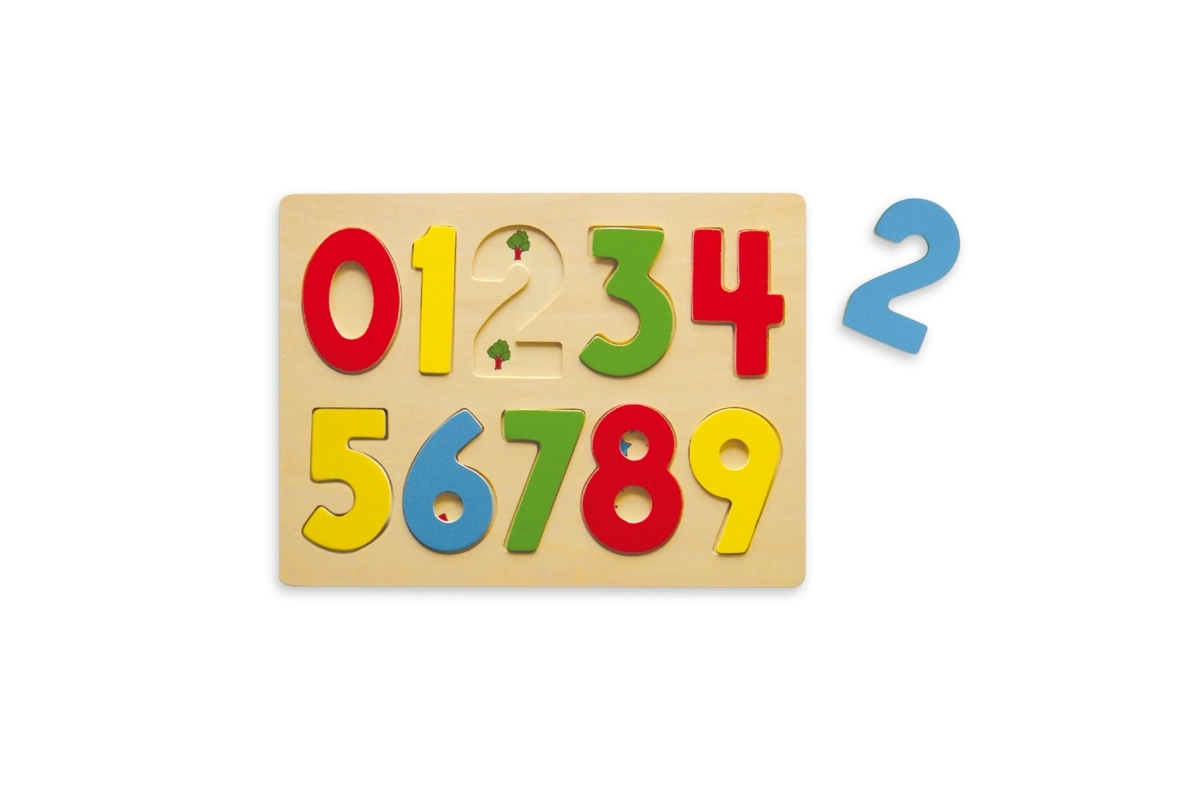 Deze houten cijfer-inlegpuzzel bevat tien afzonderlijke, kleurrijke stukjes met de cijfers 0–9, die in de bijbehorende uitsparingen worden geplaatst. Kinderen leren op een natuurlijke manier cijfers herkennen en trainen geduld en concentratie.